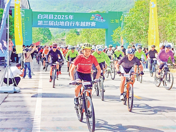 5月1日,白河縣“相約天寶·挑戰極限”第三屆山地自行車越野賽在天寶農園景區舉辦,來自廣東、廣西、四川、湖北等7省市的160余名男女運動員和騎行愛好者參與其中。朱明富 攝
