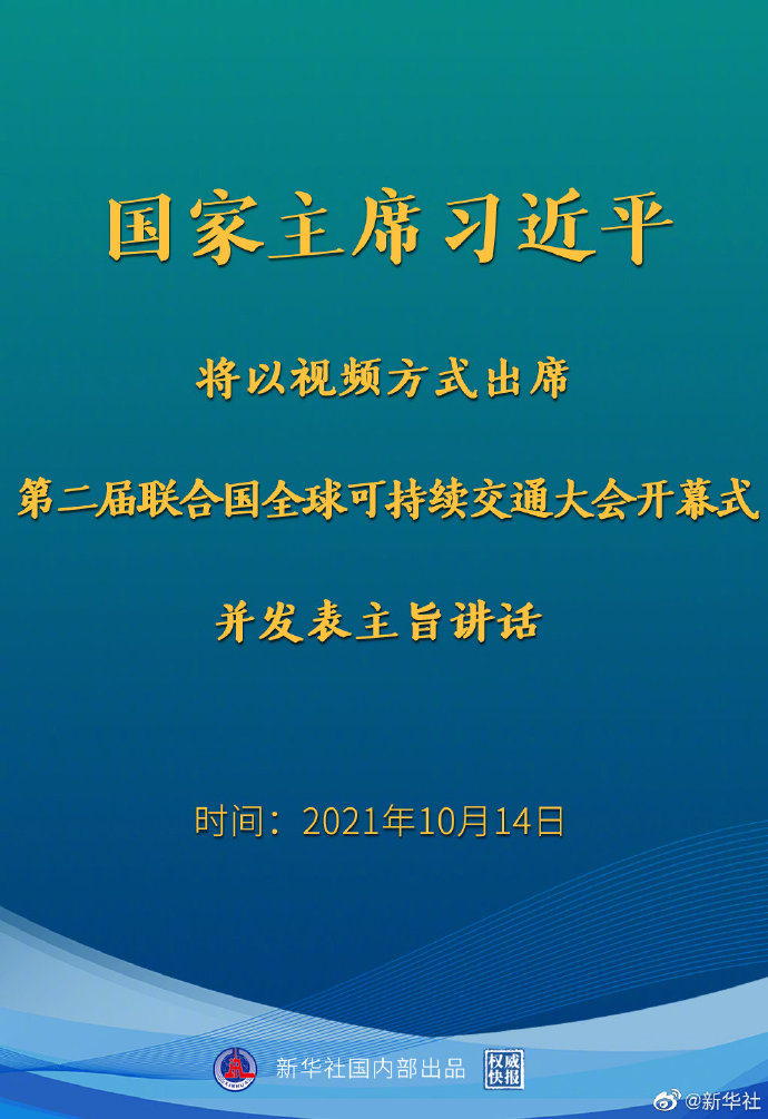 新華社北京10月13日電 外交部發(fā)言人華春瑩13日宣布:國(guó)家主席習(xí)近平將于10月14日以視頻方式出席第二屆聯(lián)合國(guó)全球可持續(xù)交通大會(huì)開幕式并發(fā)表主旨講話。MqA安康新聞網(wǎng)