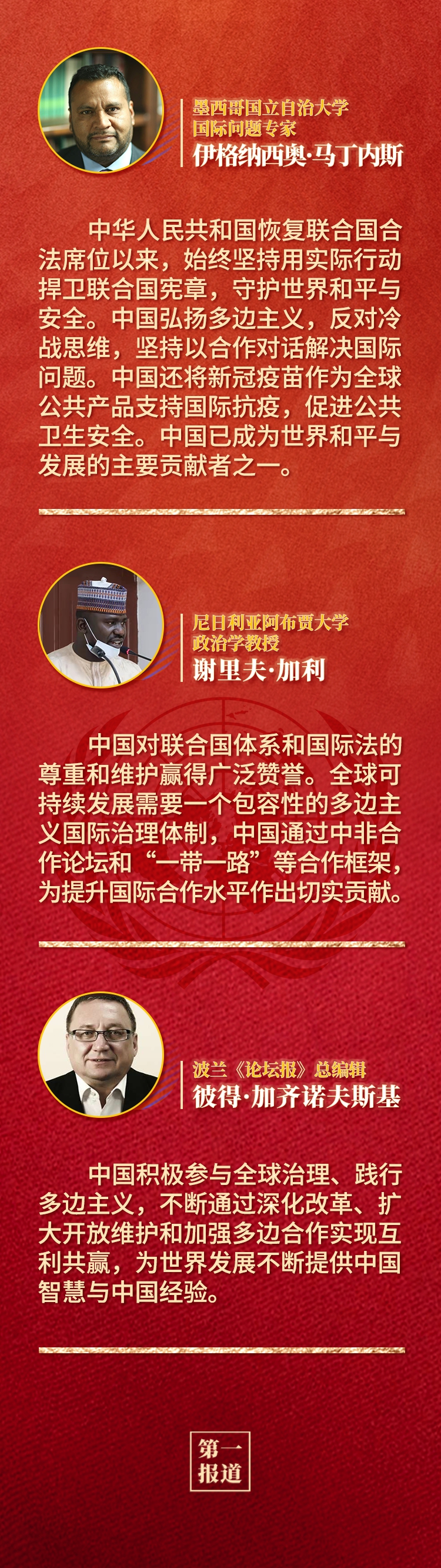 多國人士認為,中華人民共和國恢復聯合國合法席位是世界和聯合國歷史上的一個大事件,習近平主席的重要講話回顧了中國和平發展、造福人類的50年,為實現世界永續和平發展提出重要倡議,為全球共同推動構建人類命運共同體注入新的強大動力。