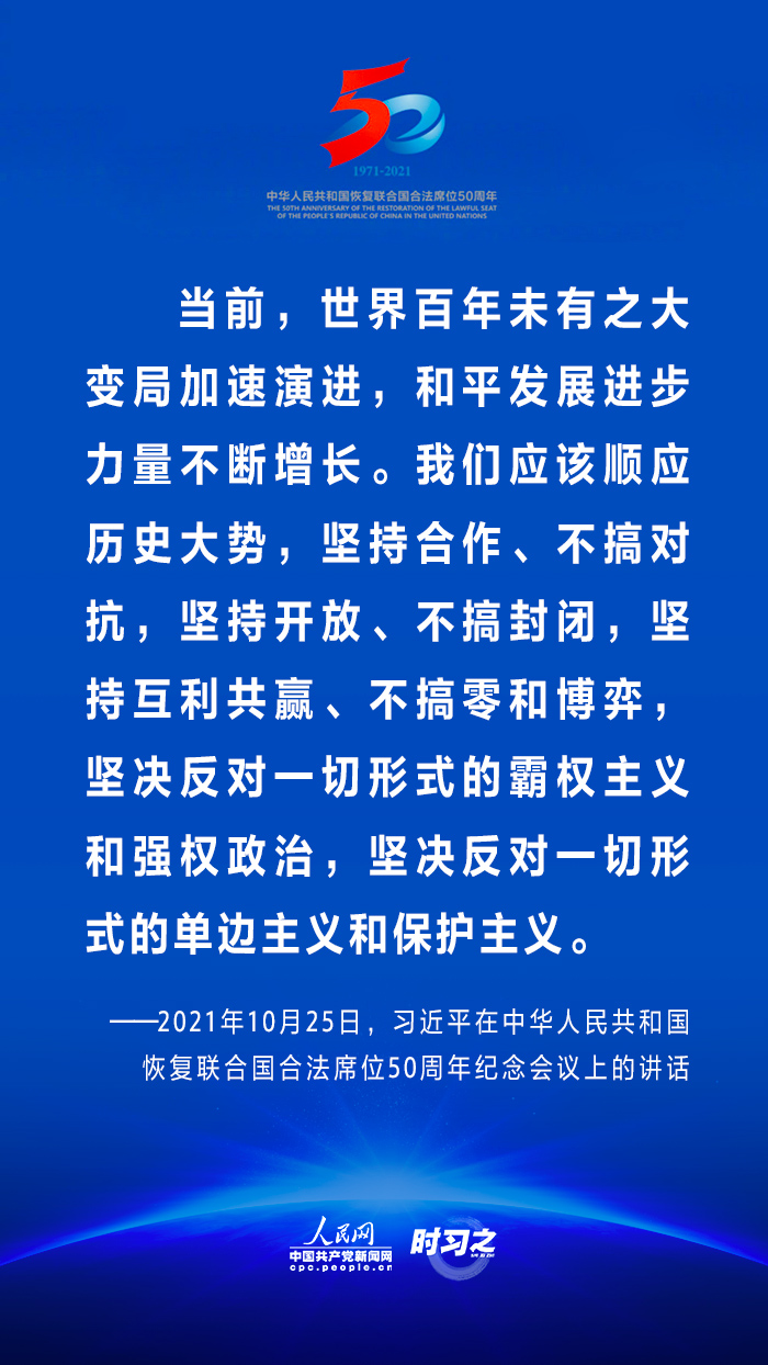 10月25日,國家主席習近平在北京出席中華人民共和國恢復聯合國合法席位50周年紀念會議并發表重要講話。在講話中,習近平回顧了中華人民共和國恢復在聯合國合法席位50年以來的重大成就,面對百年未有之大變局,重申中國將始終做世界和平的建設者、全球發展的貢獻者和國際秩序的維護者。 WTT安康新聞網