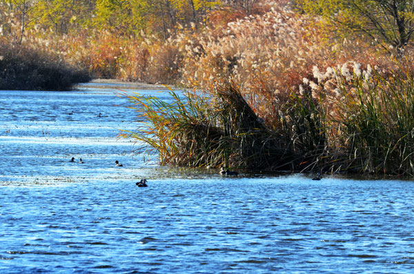 水鳥在濕地覓食、游弋(11月17日攝)。初冬時節,山東省萊西市姜山濕地碧波蕩漾,成片蘆葦隨風搖曳,數以千計的鳥兒在蘆葦叢中棲息、飛翔。該濕地總面積達2萬畝,……
