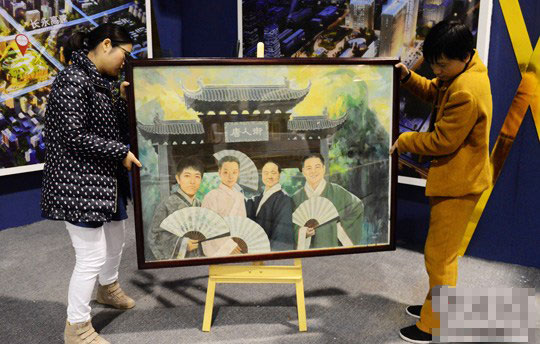 11月18日,旅法女性油畫家王俊英的作品《新四大美男圖》亮相長沙798紅館。畫中莫言、李玉剛、劉翔、陳光標分別以“智慧之美”、“俊朗之美”、“……