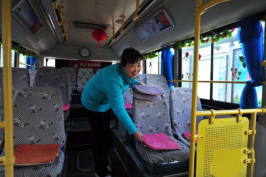 11月4日,司機正在安裝暖坐墊。中新社發(fā) 于海洋 攝11月4日,乘客坐在安放有暖坐墊的公交車。中新社發(fā) 于海洋 攝當日,在沈陽230路公交車上,每個座位上都配備了一……