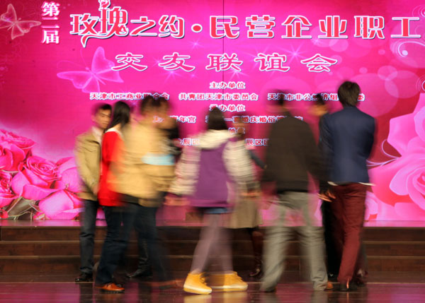 11月10日,前來相親的青年男女手牽手參與互動游戲——“桃花朵朵開”。當日,天津市“第二屆玫瑰之約·民營企業(yè)職工交友聯(lián)誼會”在天……