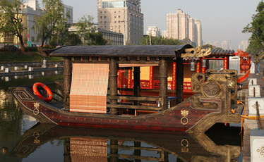 這艘仿古船有十七八米長,船內裝飾精美。西部網訊(記者 魏永賢) 4月22日早晨,西安城墻南門西側護城河上停泊著7艘“秦、漢、唐”等不同主題的仿古游船。船舶古……