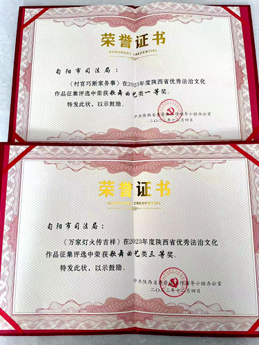本網(wǎng)訊(通訊員 黃倩) 近日,陜西省委普法辦通報了2023年度全省優(yōu)秀法治文化作品獲獎名單,共評出5類132件獲獎作品,其中由旬陽市司法局選送的原創(chuàng)普法民歌劇《村官巧斷家務(wù)事》和漢調(diào)二黃歌舞《萬家燈火傳吉祥》分別榮獲歌舞曲藝類一等獎、三等獎。