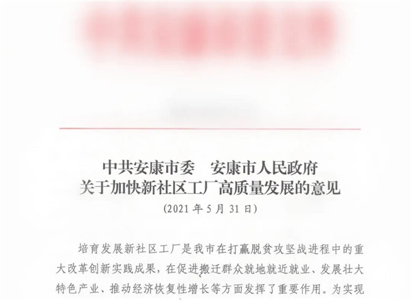 近年來,我曾多次強(qiáng)調(diào)發(fā)展新社區(qū)工廠的重要意義。在去年9月20日新社區(qū)工廠發(fā)展推進(jìn)會(huì)上,我講了“新社區(qū)工廠是促進(jìn)經(jīng)濟(jì)恢復(fù)性增長和鞏固脫貧攻堅(jiān)成果的最佳結(jié)合點(diǎn)”;在去年11月接受《民生周刊》記者專訪時(shí),我講到“推動(dòng)安康新社區(qū)工廠發(fā)展絕不是一件小事,而是關(guān)乎民生福祉和社會(huì)和諧的頭等大事”“現(xiàn)在是‘一把手’工程,今后也應(yīng)該是‘一把手’工程”。
