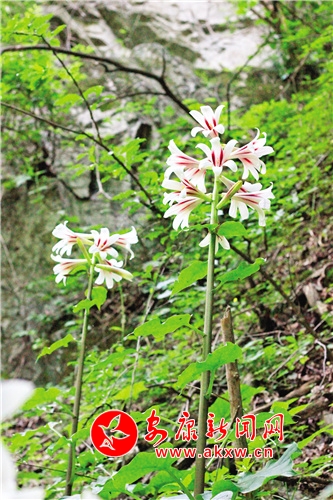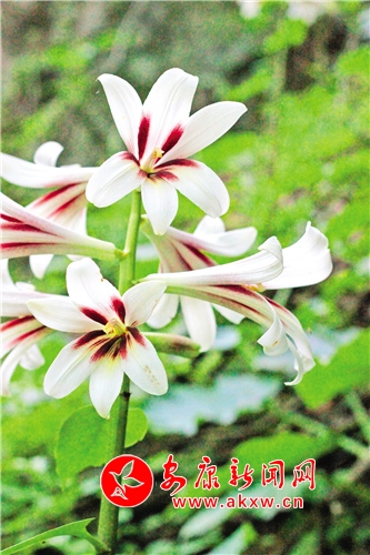 大百合生長在溪邊的山坡上,筆直的莖稈約一人高,如箭沖天,下部散有幾片寬大的綠葉,上端擎著若干喇叭狀的花兒,潔白中透著紫紅,驚艷得如同一位亭亭玉立卻羞紅了臉的美人。(圖/文 榮海) AWg安康新聞網