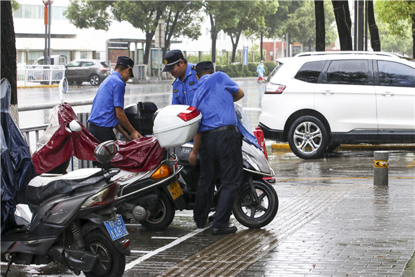 2022年7月19日,漢濱城管分局新城執法大隊的執法人員,冒著小到中雨,沿著巴山東路清理整頓占道經營和亂停亂放等不良行為。(李元武)