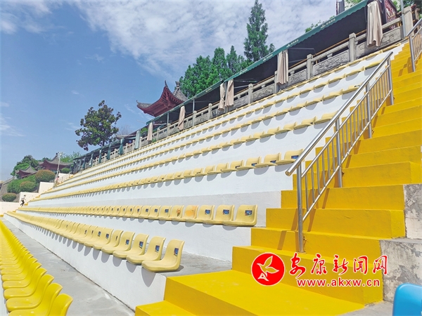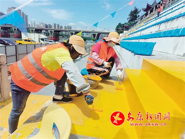 5月30日,工人們?cè)诘诙膶冒部禎h江龍舟節(jié)主會(huì)場(chǎng)進(jìn)行地面第二輪刷漆。據(jù)市市政園林處現(xiàn)場(chǎng)負(fù)責(zé)人介紹,截至目前,已搭建隔離護(hù)欄3715米,建立安檢門及疏散通道18個(gè)、蛇形通道8個(gè),制作安裝導(dǎo)視牌10塊,對(duì)看臺(tái)區(qū)立面刷漆2629平方米,擦拭清洗并固定座椅3794個(gè)。錢運(yùn)立 攝